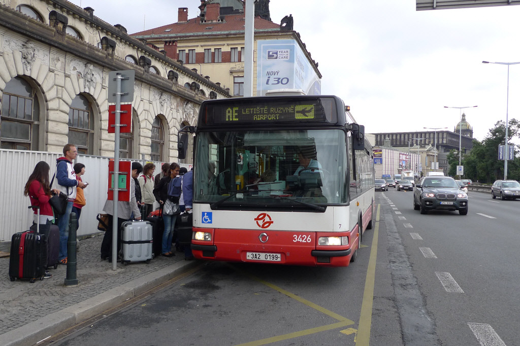 The Airport Express or AE is a special direct bus service between the airport and the main railway station Praha hlavní nádraží, running every 15-20 minutes for most of the day and taking approximately 45 minutes from the airport (Terminal 1) to the city, or 33 minutes from the city to the airport, where it also calls at Terminal 2 (in this direction only). Allow for delays as traffic can be heavy.