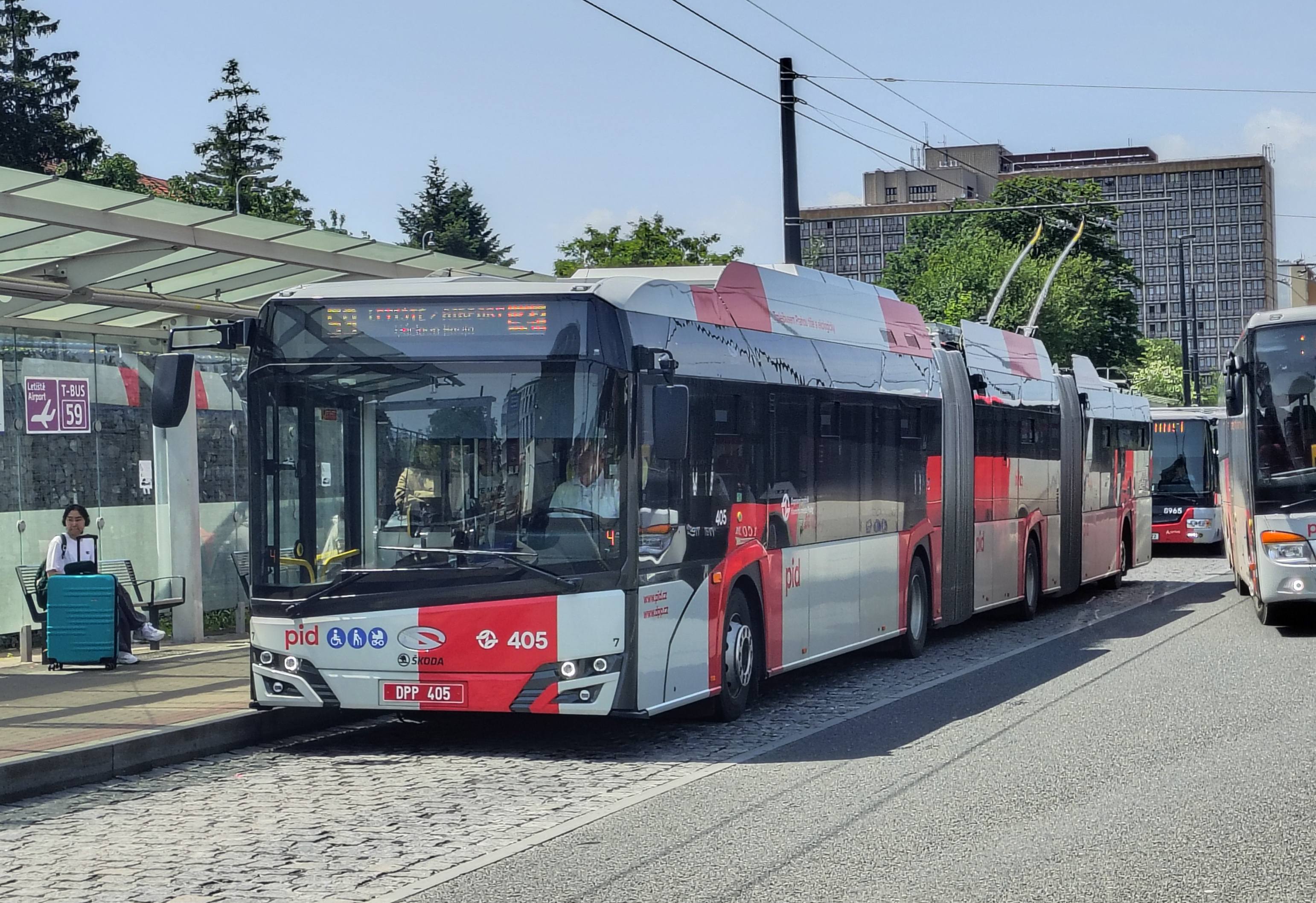 Trolleybus 59 (which replaced bus 119 in March 2024) is the most frequent service and runs from the airport to Nádraží Veleslavín metro station on metro line A. The bus starts from Terminal 1 and calls at Terminal 2 (flights from Schengen countries), taking 17 minutes to Nádraží Veleslavín. For most of the day trolleybus 59 runs every 4-5 minutes (every 7-8 minutes at weekends), but at quieter times (late evening for example) the frequency is every 10 minutes.